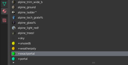 . | Exact portal property. This symbol can be used for materials which are always used on surfaces that perfectly separate one space from another. In other words, they will work just like +exactportal. This is an easy way to automatically create some exact portals where you have enclosed spaces behind glass and grates. |