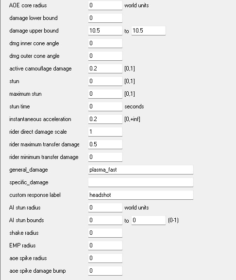 This section is where the actual numbers of this damage effect are specified. Defines other properties like vehicle transfer damage, stun, knockback, damage angles for melee, damage type and the response label as well.